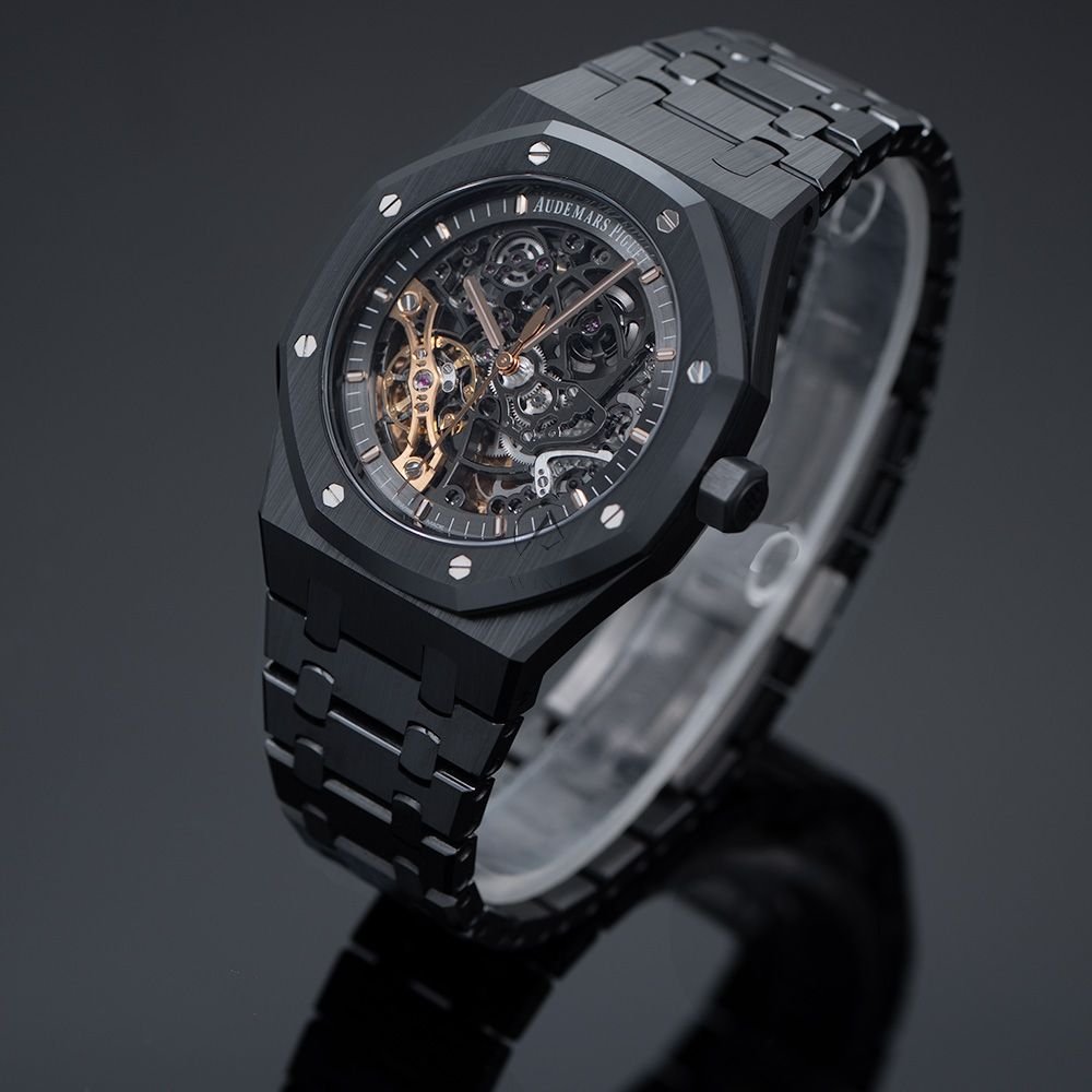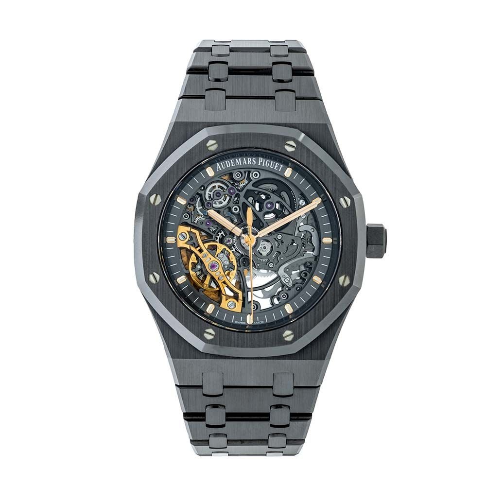 The Audemars Piguet Royal Oak 15416CE is a masterful blend of innovation and luxury. This striking timepiece features a 41mm ceramic case, making it both lightweight and highly durable. The openworked dial, a signature of the Royal Oak collection, reveals the intricate double balance wheel mechanism, providing a stunning view of the watch’s complex inner workings. The bold contrast of the black ceramic case against the meticulously crafted skeleton dial creates a modern yet refined aesthetic. Powered by the in-house Caliber 3132, this timepiece delivers precision and reliability, all while maintaining the classic Royal Oak design that has made it a timeless icon in the world of horology. A true collectors piece, the Royal Oak 15416CE is as much about craftsmanship as it is about style.