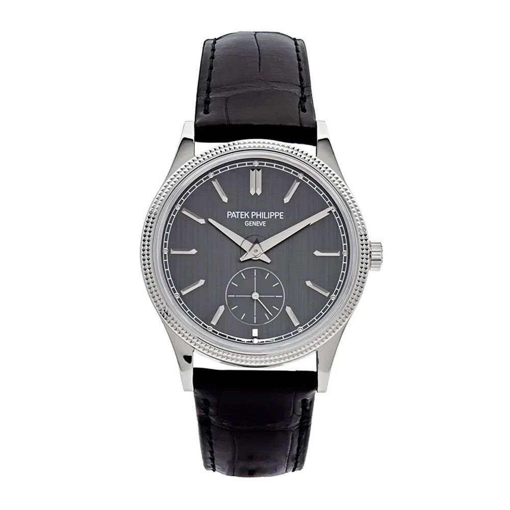The Patek Philippe Calatrava 6119G-001 is a stunning embodiment of refined craftsmanship and timeless elegance. Featuring an 18K white gold case, this 39mm timepiece exudes understated luxury. The watchs grey dial with a sunburst finish enhances its sophisticated appearance, while the sleek white gold hour markers and hands provide optimal legibility. The Calatrava 6119G-001 is powered by the Patek Philippe Caliber 30-255 PS, an ultra-thin automatic movement known for its precision and reliability. The elegant alligator leather strap complements the watch’s refined aesthetic, making it perfect for both formal and casual occasions. A perfect choice for collectors, this watch showcases Patek Philippes commitment to timeless design and exceptional horological artistry.