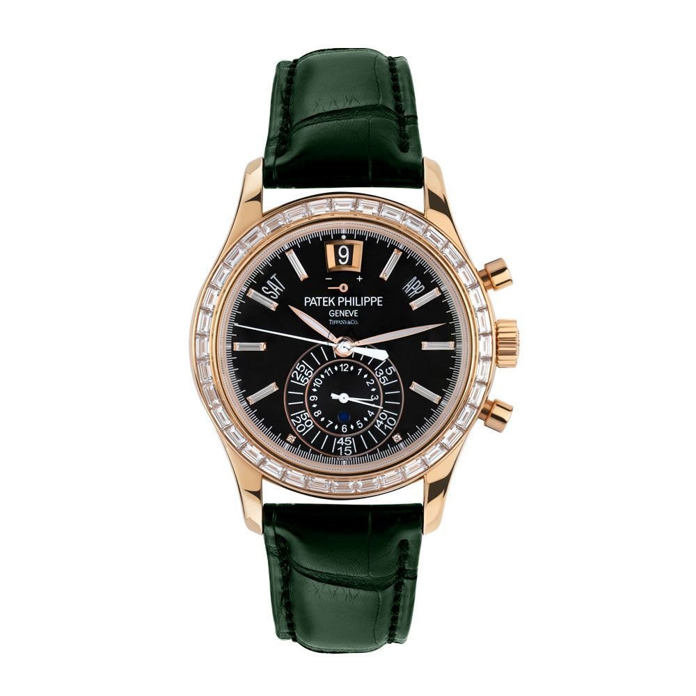 The Patek Philippe Complications 5961R-010 is a striking blend of haute horlogerie and high jewelry. Encased in 40mm of luxurious 18K rose gold, this timepiece commands attention with a black dial set with baguette diamond hour markers and a bezel adorned with 36 flawless baguette-cut diamonds. At the core of its functionality lies a sophisticated flyback chronograph with an annual calendar, offering day, date, and month displays in elegant apertures. The sunburst black dial adds depth and drama, beautifully balancing sporty functionality with refined aesthetics. Powered by the self-winding Caliber CH 28-520 IRM QA 24H, this watch is as technically impressive as it is visually stunning. Its a bold expression of Patek Philippes ability to marry precision engineering with timeless luxury.