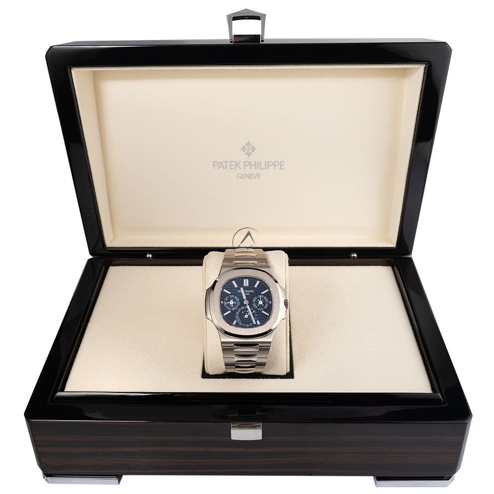 The Patek Philippe Nautilus 5740/1G-001 elevates the iconic sport-luxury design with the technical sophistication of a perpetual calendar. Housed in a refined 40mm case crafted from 18K white gold, this exceptional timepiece exudes understated elegance. Its sunburst blue dial, featuring horizontal embossing and integrated calendar sub-dials, delivers both visual depth and legibility. Ultra-thin yet mechanically complex, the watch is powered by the self-winding Caliber 240 Q, offering a perpetual calendar with moon phases and leap year indicationall within one of the most iconic silhouettes in horology. The integrated white gold bracelet completes this modern masterpiece, making it the ultimate expression of everyday haute horlogerie.