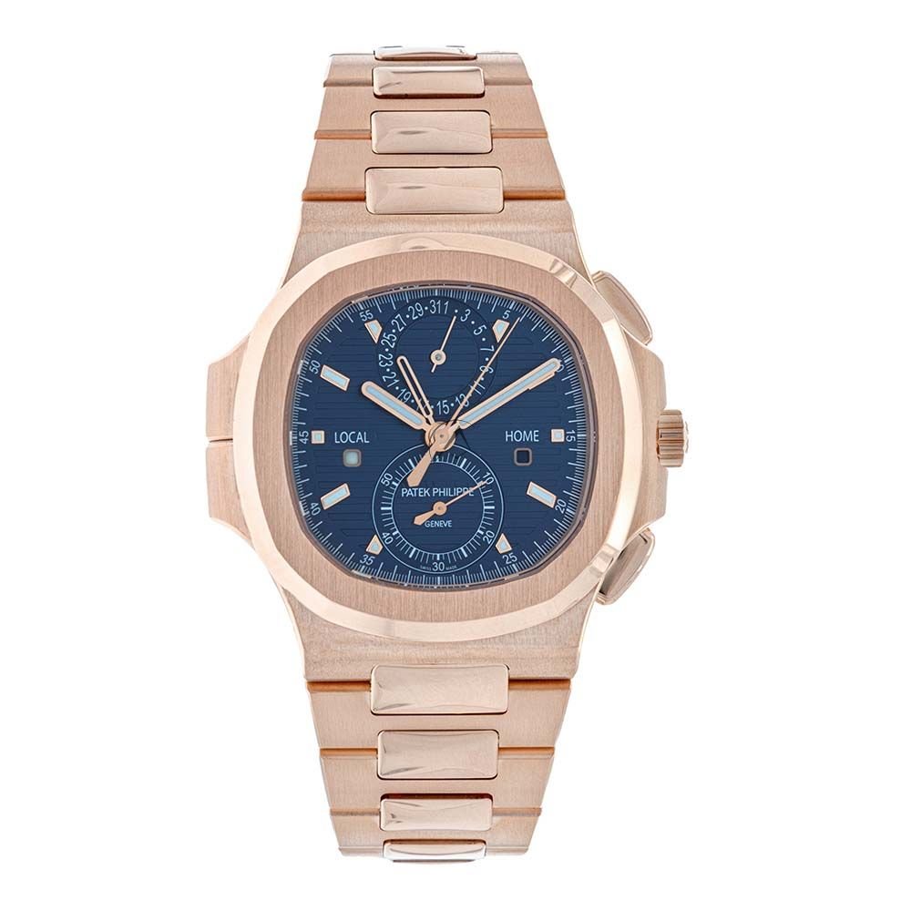 The Patek Philippe Nautilus 5990/1R-001 in 18K rose gold combines elegance with advanced functionality, offering a timepiece that stands as a true statement of luxury. The 40mm case, crafted from rich rose gold, surrounds a stunning blue dial with a sunburst finish that creates a mesmerizing play of light. This iconic Nautilus features a chronograph, dual-time zone function, and an integrated date display, all powered by the reliable self-winding Caliber CH 28-520 C movement. The watchs intricate design and polished aesthetic are matched with a sporty yet refined look, making it the perfect companion for both formal occasions and everyday wear. With a water resistance of 120 meters, the Nautilus 5990/1R-001 ensures both style and practicality.