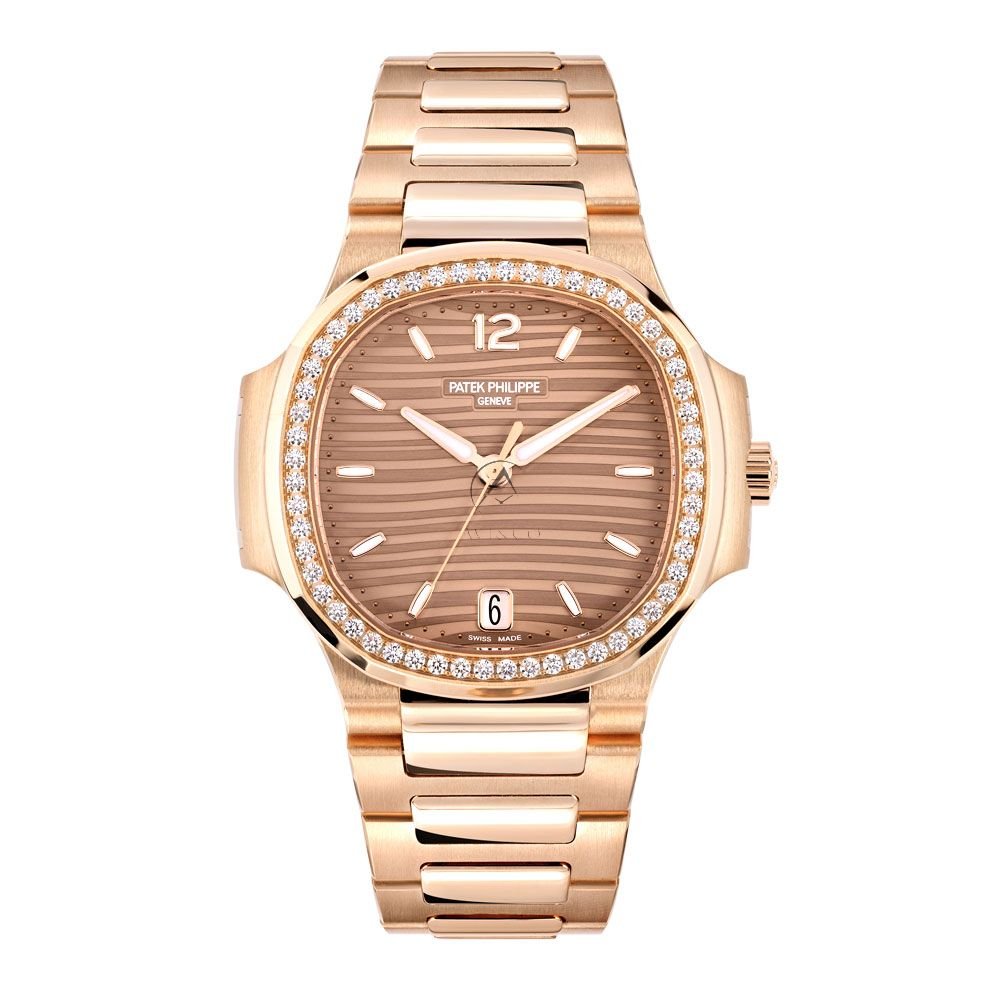 The Patek Philippe Nautilus 7118/1200R-010 is a graceful expression of sport-luxury, designed for the modern woman with a refined eye. Crafted from 18K rose gold, the 35mm case and integrated bracelet offer a warm, elegant presence on the wrist. The golden brown opaline dial, accented with a horizontal wave motif, captures the light beautifully and pairs seamlessly with rose gold applied hour markers. A sparkling bezel set with 56 diamonds enhances its sophisticated silhouette, while the self-winding Caliber 324 S C ensures precision and reliability. With a perfect balance of femininity, technical excellence, and iconic Nautilus design, this timepiece is as versatile as it is exquisite.