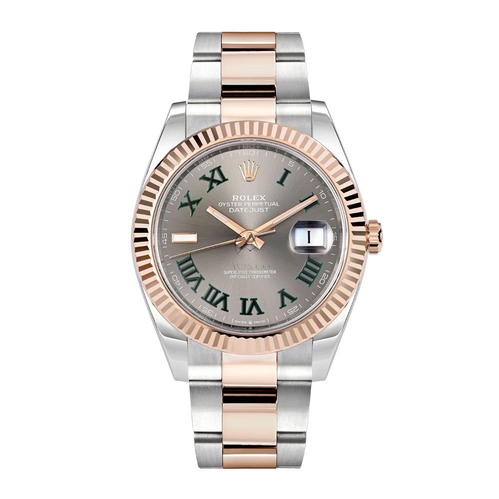 The Rolex Datejust 41 ref. 126331 seamlessly blends sporty sophistication with classic elegance. This striking 41mm timepiece pairs robust Oystersteel with warm 18K Everose gold, creating a refined two-tone aesthetic known as Rolesor. Its signature Wimbledon dialcharacterized by a slate grey sunray finish, bold green Roman numerals, and a date display beneath the Cyclops lensadds a modern yet timeless appeal. The fluted bezel, crafted in Everose gold, reflects light with every movement, while the Oyster bracelet ensures comfort and durability. Equipped with the Rolex Caliber 3235, this self-winding watch delivers precision, power reserve, and performance that meet the highest standards of Swiss watchmaking.