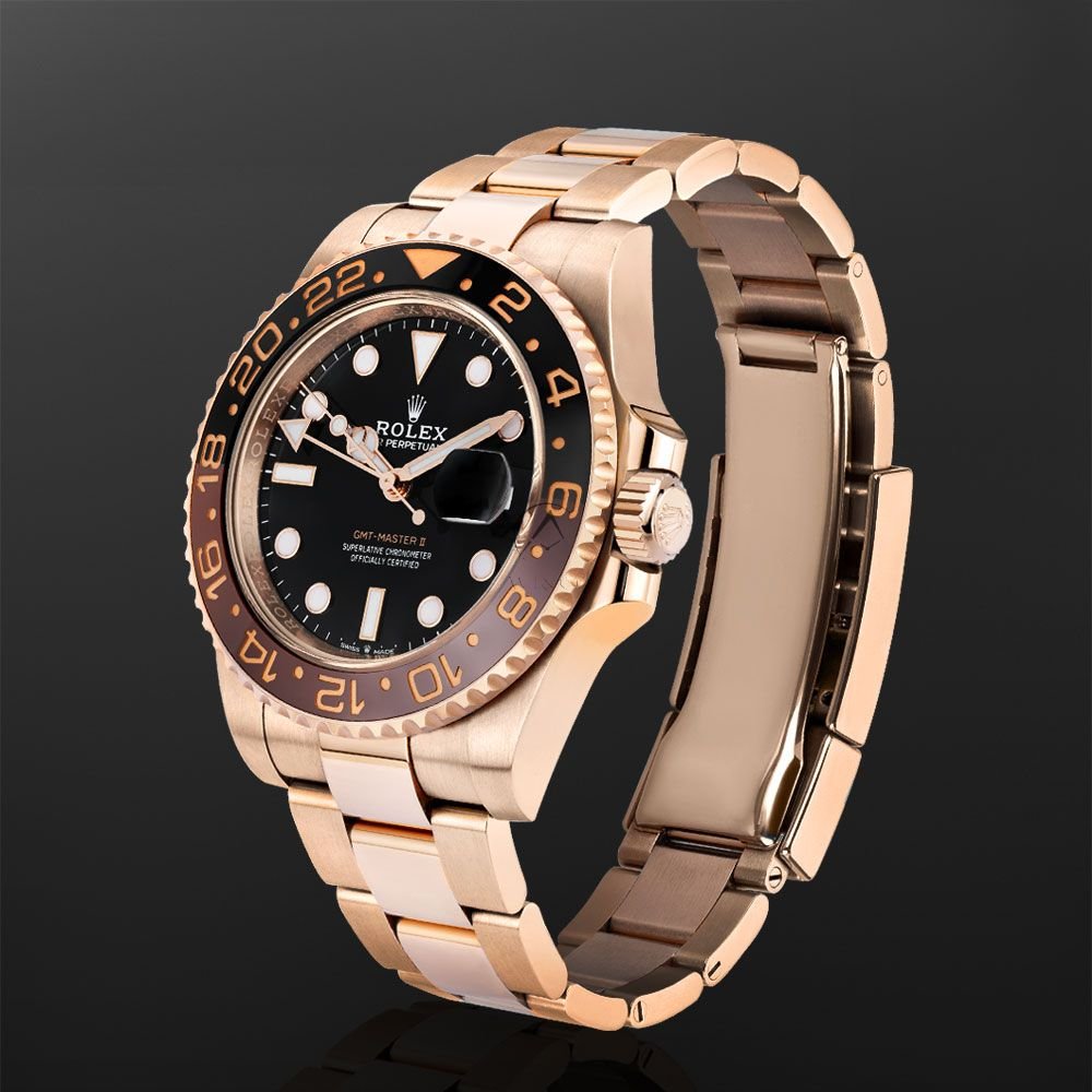 The Rolex GMT-Master II 126715CHNR is a bold and luxurious take on a travel icon, crafted entirely in 18K Everose goldRolexs proprietary rose gold alloy. Measuring 40mm, the Oyster case is paired with a sleek black dial and the signature two-tone Cerachrom bezel in black and brown, often affectionately referred to as the “Root Beer” by collectors. Designed for world travelers, this model features a second time zone display with a dedicated 24-hour hand, powered by the high-precision Caliber 3285 with a 70-hour power reserve. Fitted with the solid-link Oyster bracelet and a polished center link finish, the 126715CHNR combines technical innovation with elevated styleperfect for those who demand performance with a refined edge.